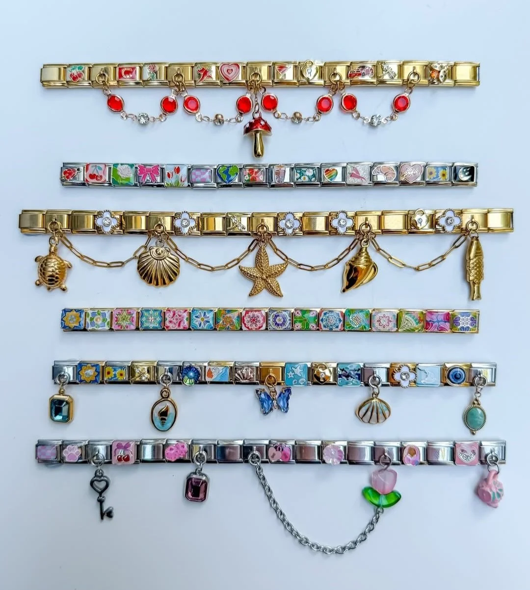 Italian charm bracelets are made of individual modular links that snap together to form a sleek, flexible bracelet. Each link features a different design — from letters and zodiac signs to hearts, travel icons, sports, symbols, initials, birthstones, and meaningful quotes. Unlike dangling charm bracelets, these lie flat on the wrist, giving a clean, modern, stackable look.